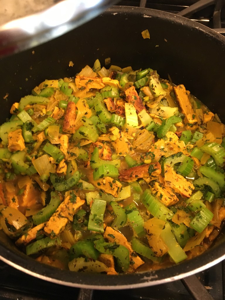 I was initially wary of a celery dish, but I liked it. It made me think of the Packers: green celery and split peas, and gold turmeric-covered meat and onion. For “meat” I used Quorn meatless steak-style strips.