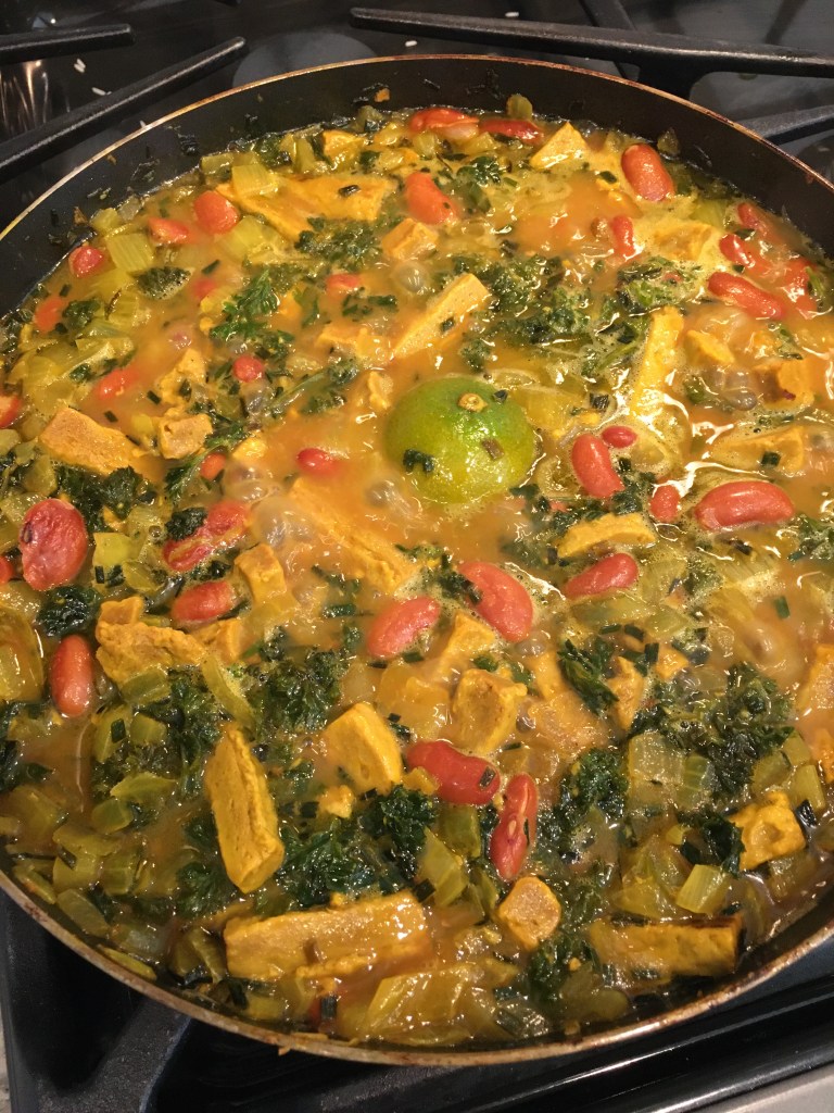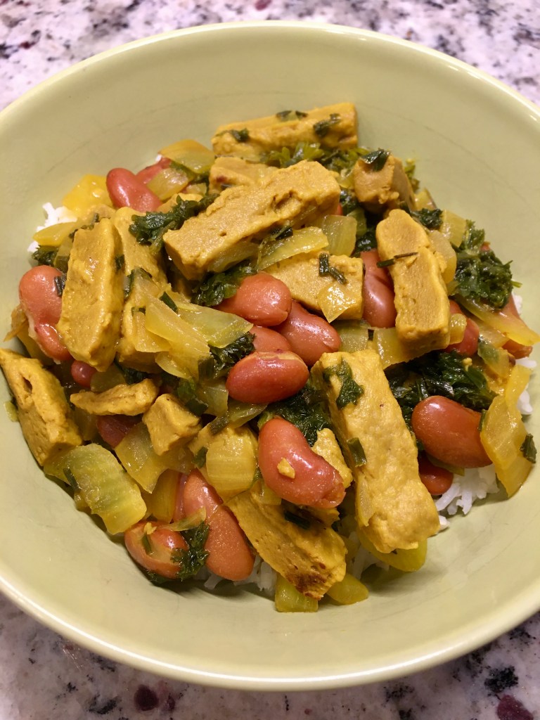 Instead of the stew being composed primarily of herbs, it ended up with herbs just sprinkled throughout. Maybe it’s because I omitted fenugreek since I couldn’t find it at the grocery store. In any case, it wasn’t bad, just different. For “meat” I used Quorn meatless steak-style strips.