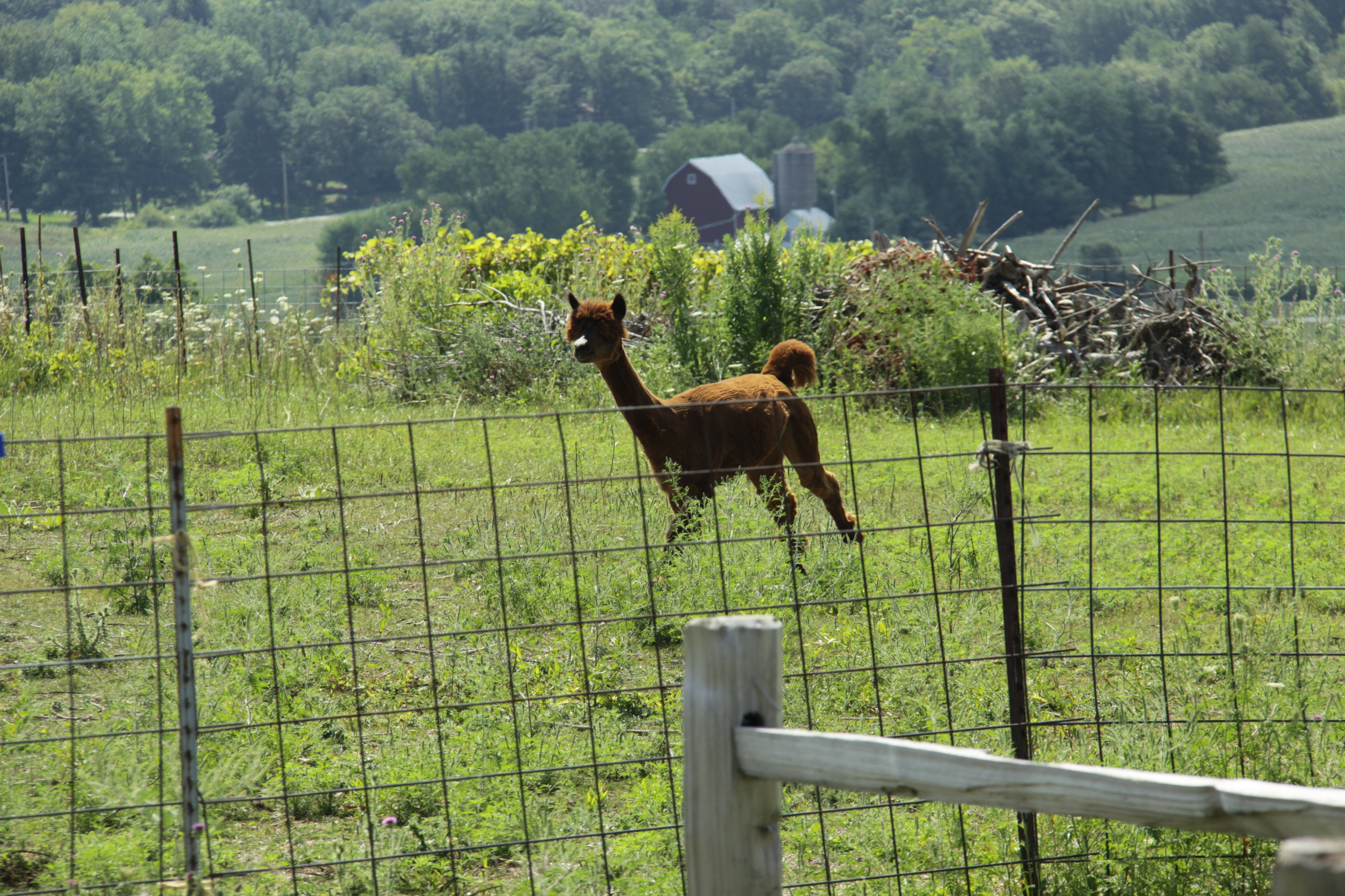 In the rolling hills of south-central Wisconsin roam camelids hailing from further south–South America, that is. At the honeymoon B&B, Sergey and I encountered a pair of alpacas. Alpacas are much like llamas, but more docile. One of the alpacas fit this description; white-furred like a lamb, it appeared uninterested in anything besides chewing its cud. The other, however, acted as the guardian of the pen. When we approached the enclosure, this redhead came charging at us. When I commented on his aggression to Sergey, he defended the beast. “He just wants to say hi!”