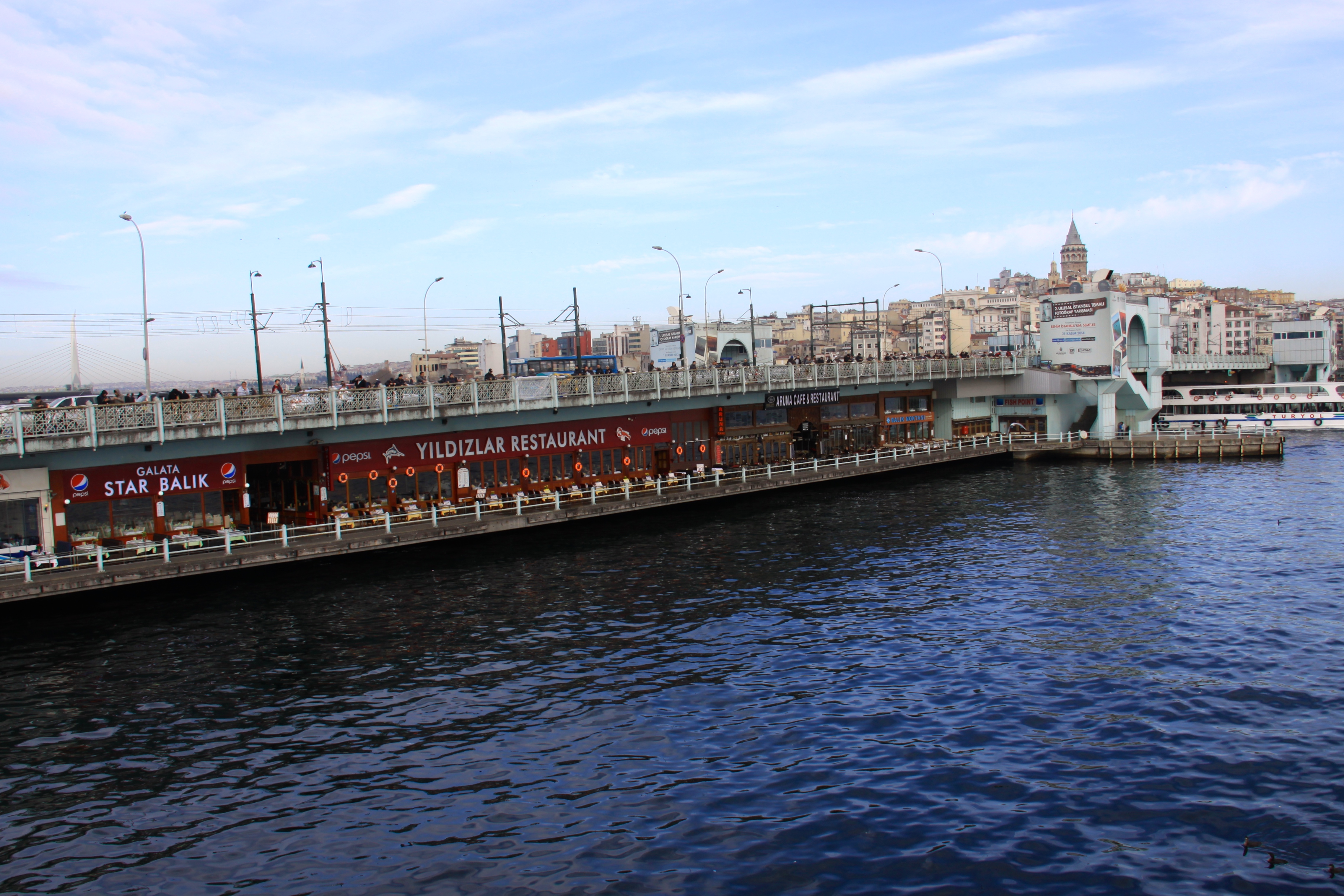 The boat was docked near the bridge across the Golden Horn, over which the tram passes back and forth to the New District. Below the traffic on the lower, pedestrian level of the bridge, there is a row of seafood restaurants. At 10:00 AM their staff were just starting to clean and prepare for a day of customers, and we watched in amusement as they hauled up water from the strait below to swab the decks of their outdoor seating. In that act, I was reminded of how provident the sea and its estuaries are to coastal cities. Little wonder then that successive empires made this area the focus of their empires, surrounded as it is by a natural moat of generous and protective waters.
