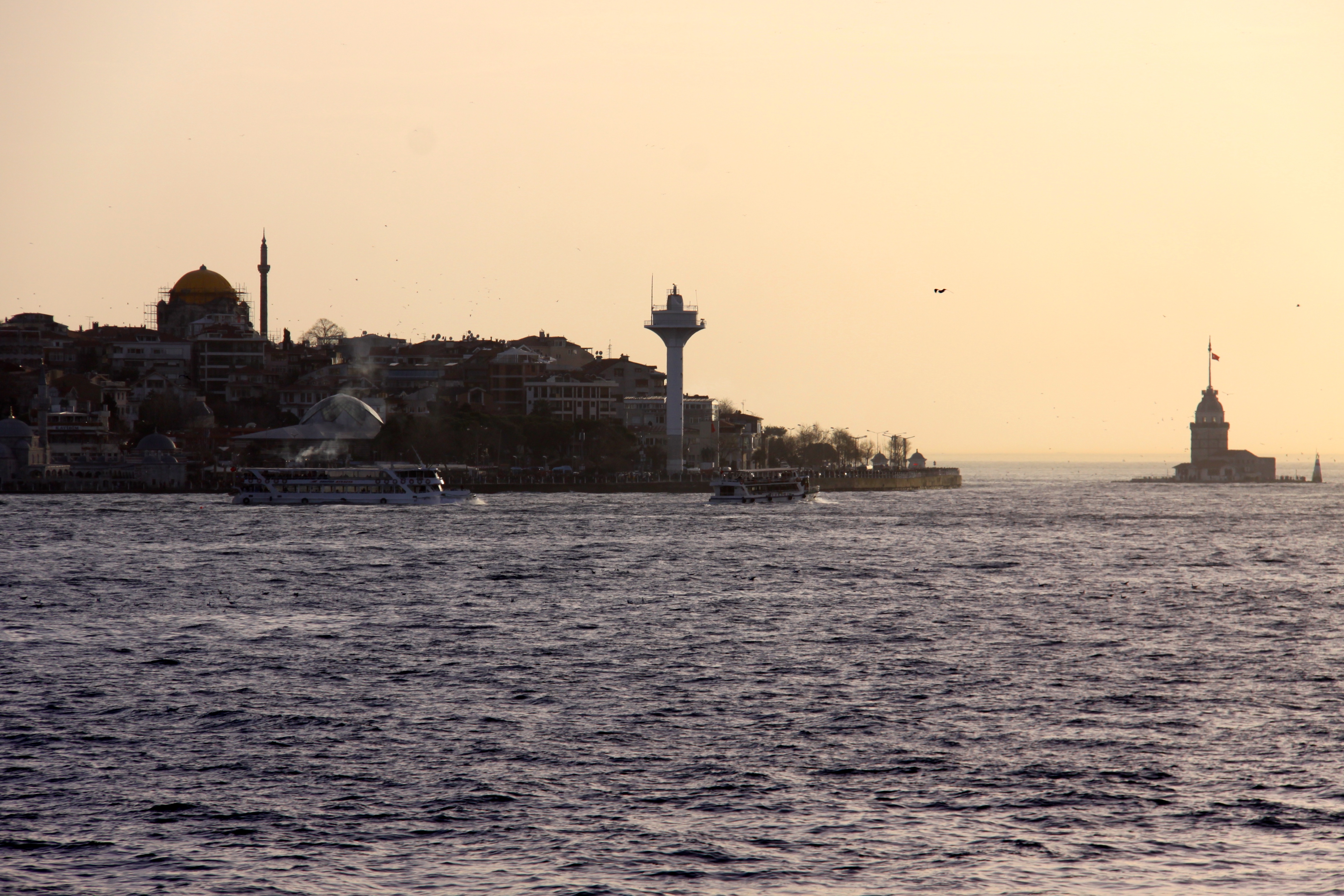 Towards the end, though, I decided I had to go to the top so I could finally photograph one of Istanbul’s well known sights, Maiden’s Tower, which sits upon a small island. As we neared the European side, the setting sun set the cityscape aglow, smears of saffron light upon the minarets of countless mosques…and neon light upon the signs of countless seafood eateries.
