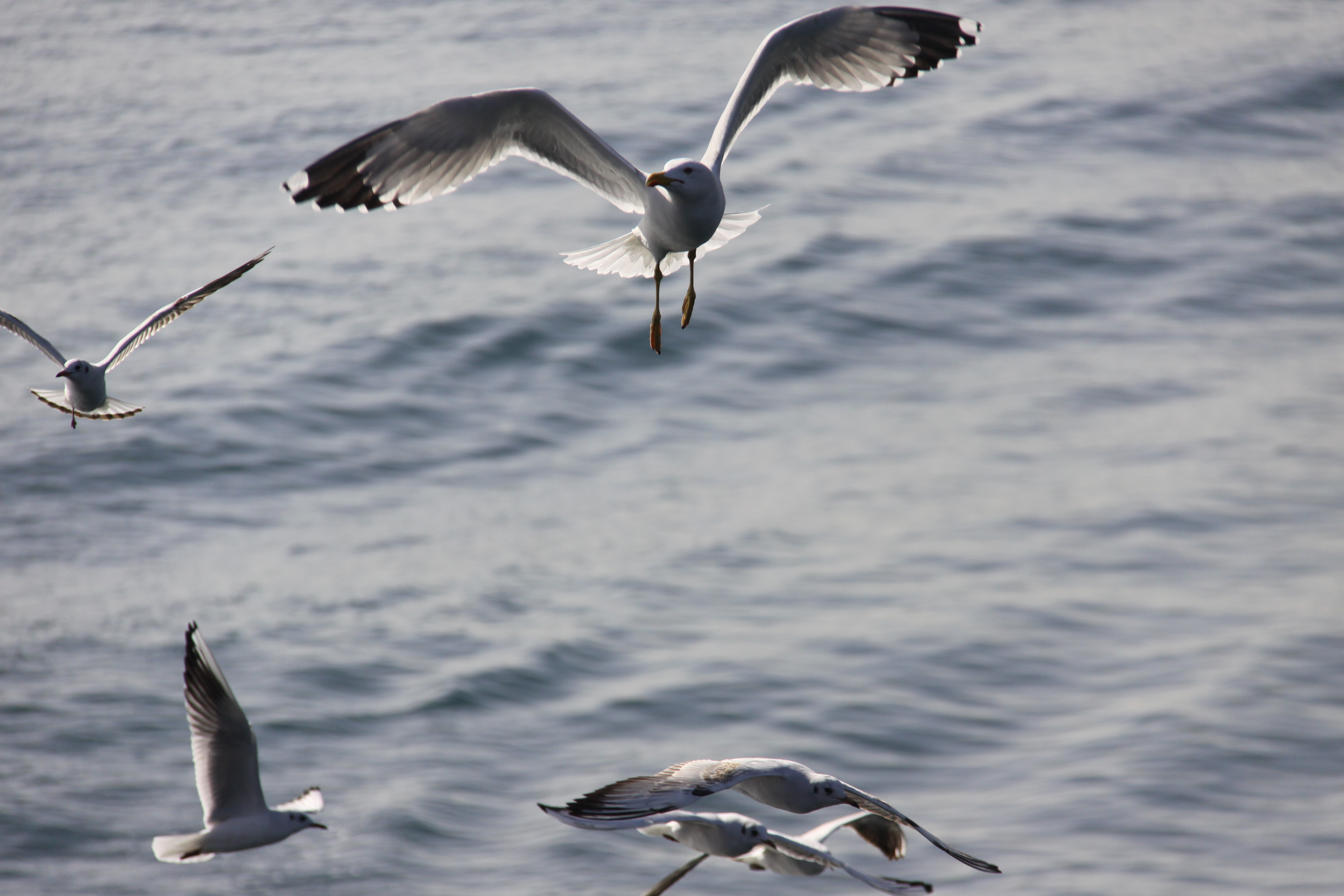 When we would approach the shore to pick up more passengers, flocks of seagulls would attach as if magnetically to our boat and hover around. Perhaps the wake of the boat stirred up small creatures for their lunch, or maybe they hoped we would jettison our own food—in any case, Jasmine encouraged me to get some action shots of these birds. There were, in fact, several species of seagulls, ranging from a long-winged pterodactylesque breed with harsh eyes to a chubbier, smaller variety with the charm of a flying porpoise.