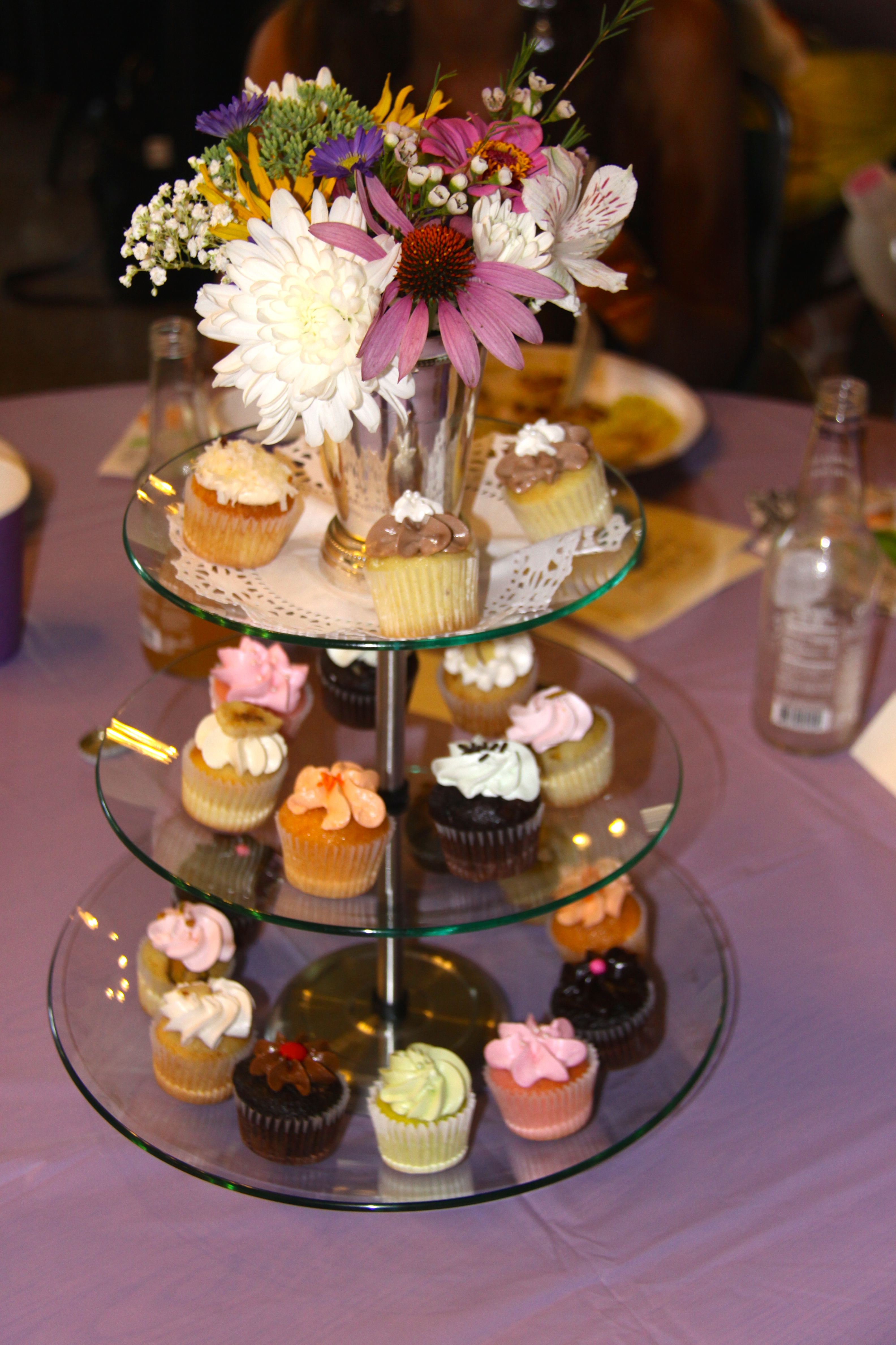 Luckily we decided on a more classy alternative: three-tiered stands covered with colorful cupcakes and topped with a spray of flowers, which my uncle generously arranged.  After finding a cute Wilmette bakery called Lawrence Deans online during my initial investigations, I spent the next few months contemplating which flavors of their selection I wanted at the wedding (all of them).  Especially the rose-pistachio ones.  In the end, we ordered a mere 132 cupcakes in 11 flavors, chosen both for their deliciousness and their colors.  You can see the results below.