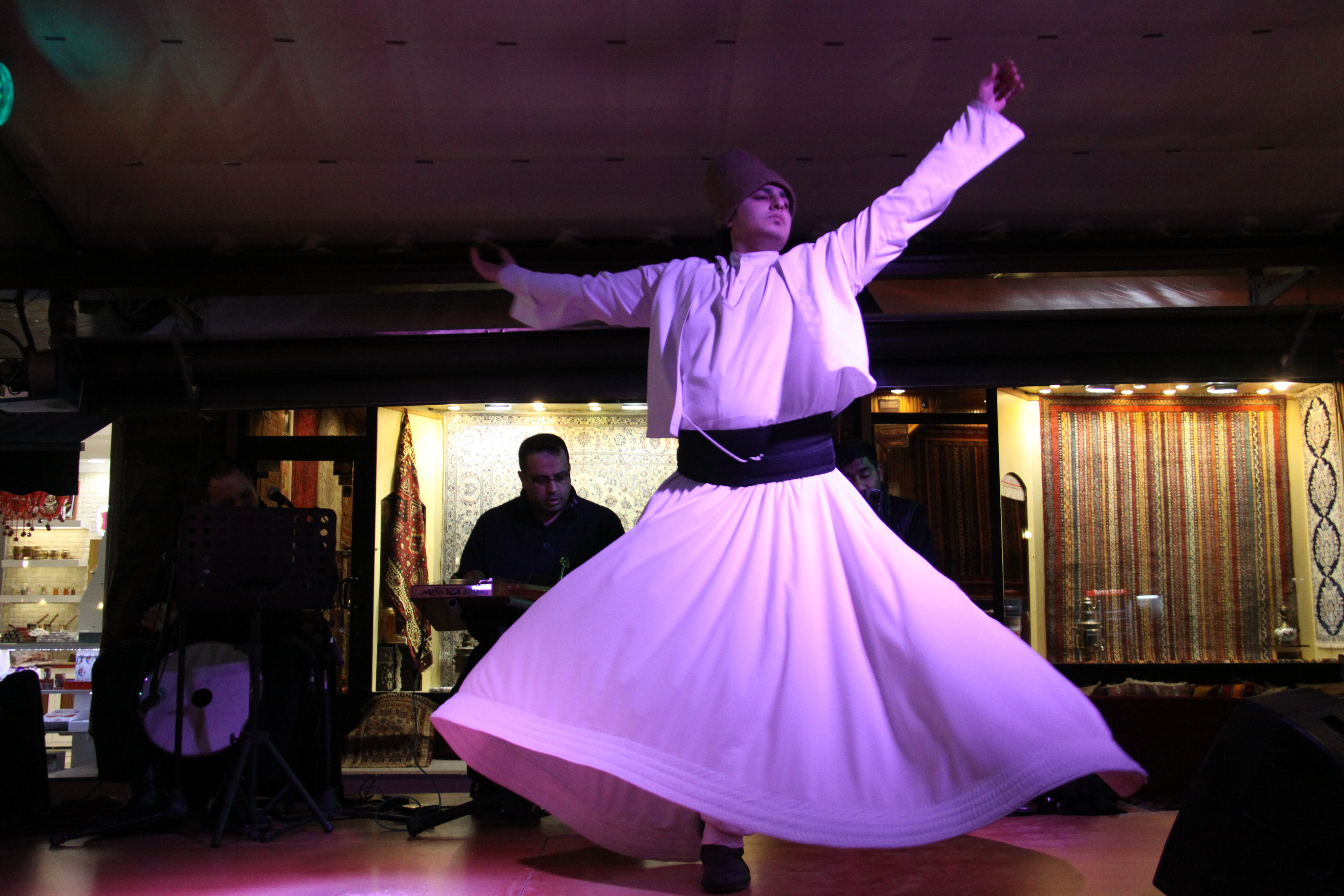 Entranced, we watched from the sidewalk, and then decided it was worth eating a freezing al fresco dinner to see him whirl. While I’m always skeptical of the authenticity of “cultural” activities in a tourist district, he seemed to be legitimately meditating as he spun, eyes nearly closed, apparently unconscious of his audience, including the paparazzi in the front row seats (us).