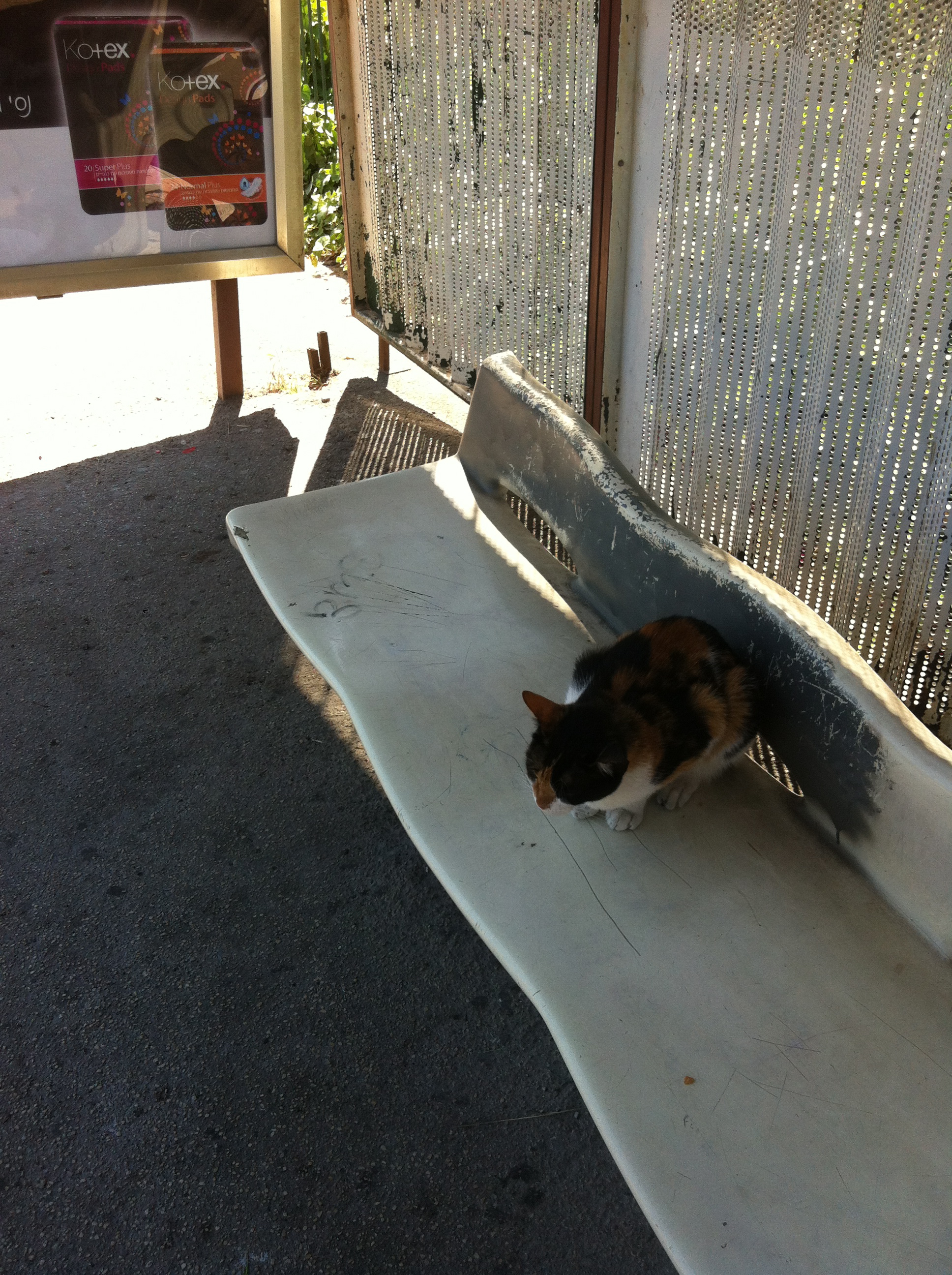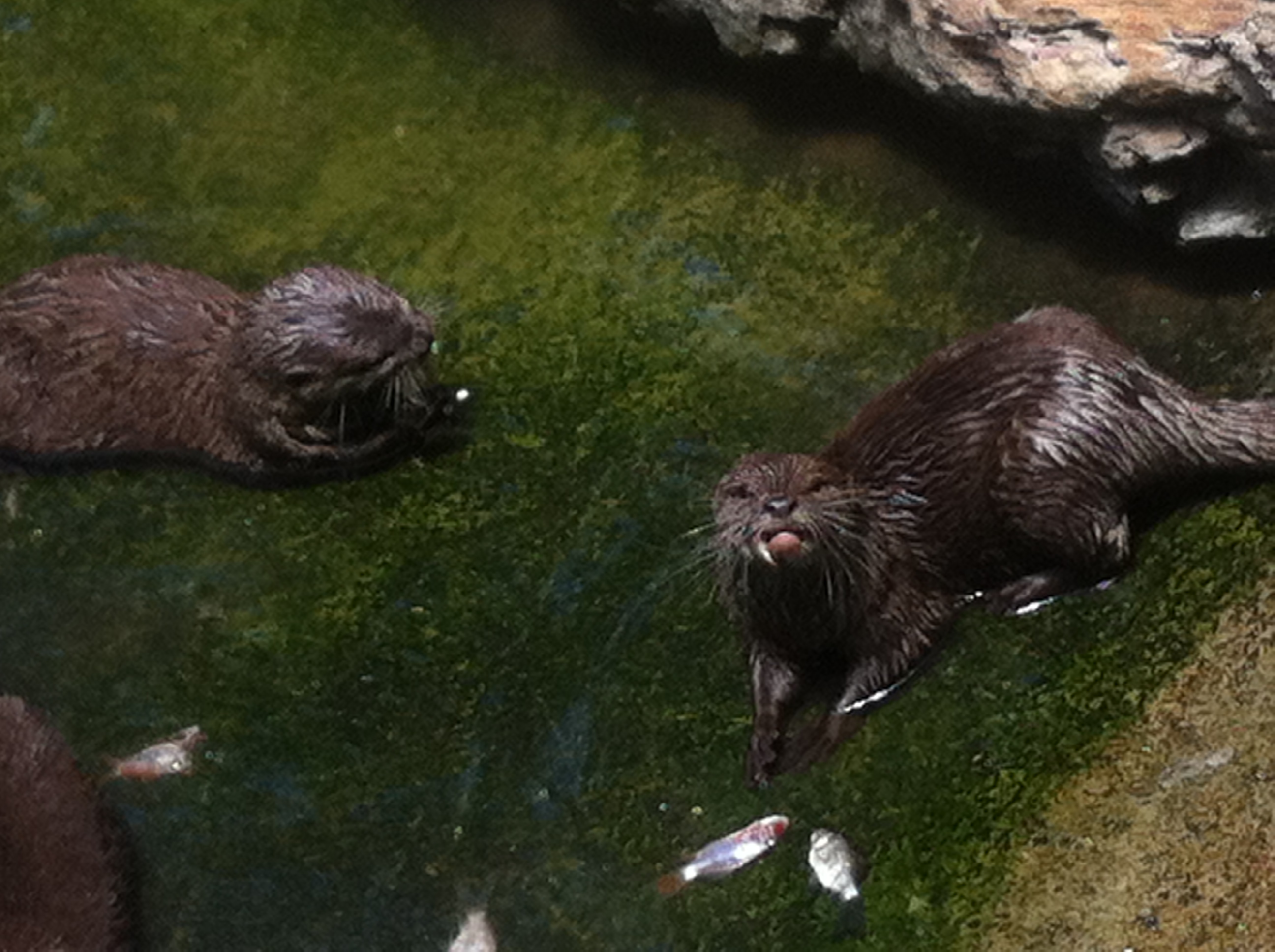 As for the cats, on my first day I went to the bus stop, where a cat with bright green eyes was waiting, I think for line 36. He was sitting on the bench and I joined him. He immediately avowed his affections for me by climbing into my lap. Envisioning tiny fleas hopping onto me, I stood up, and he jumped down only to wend between my ankles. But surely the most remarkable stray story thus far happened at Haifa Zoo. I was familiar with this zoo from a lecture by Israeli zoologist Avinoam Lourie, but while I knew the story of its fallow deer population, I did not know about its otter-kitten relations. Picture this: four sleek otters, chirping at the zookeeper as he dumps in their lunch of fish; two scrawny kittens in the exhibit, peeking out from behind some rocks. Tentatively, the kittens approached the fish. The otters and kittens seemed equally afraid of each other, and when the otters backed off a bit, the kittens began to snatch fish, scurry back to their hideout, then return for more. Who knows, maybe the otters will embrace the kittens as their own and become a feature on an “unlikely animal friends” documentary.