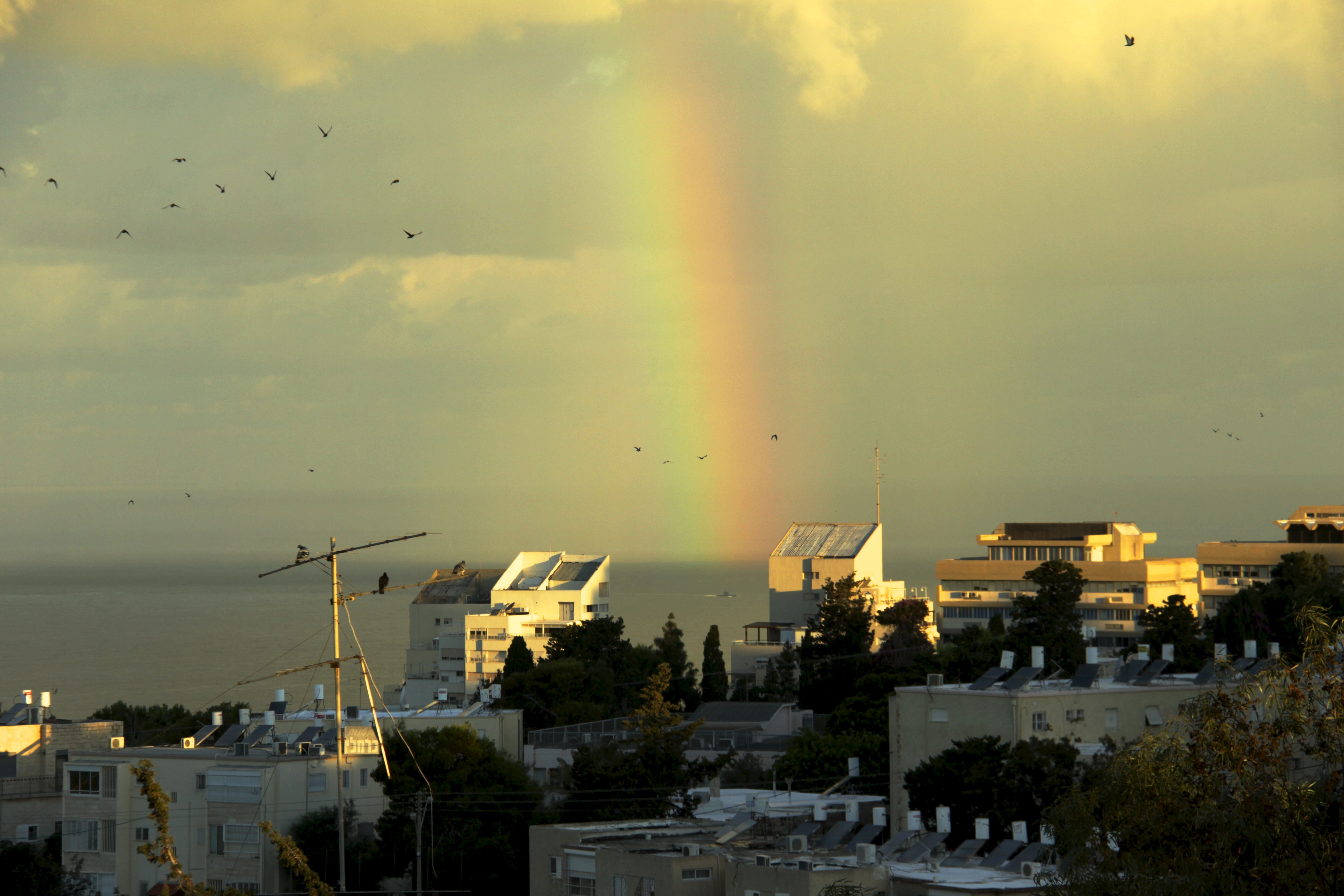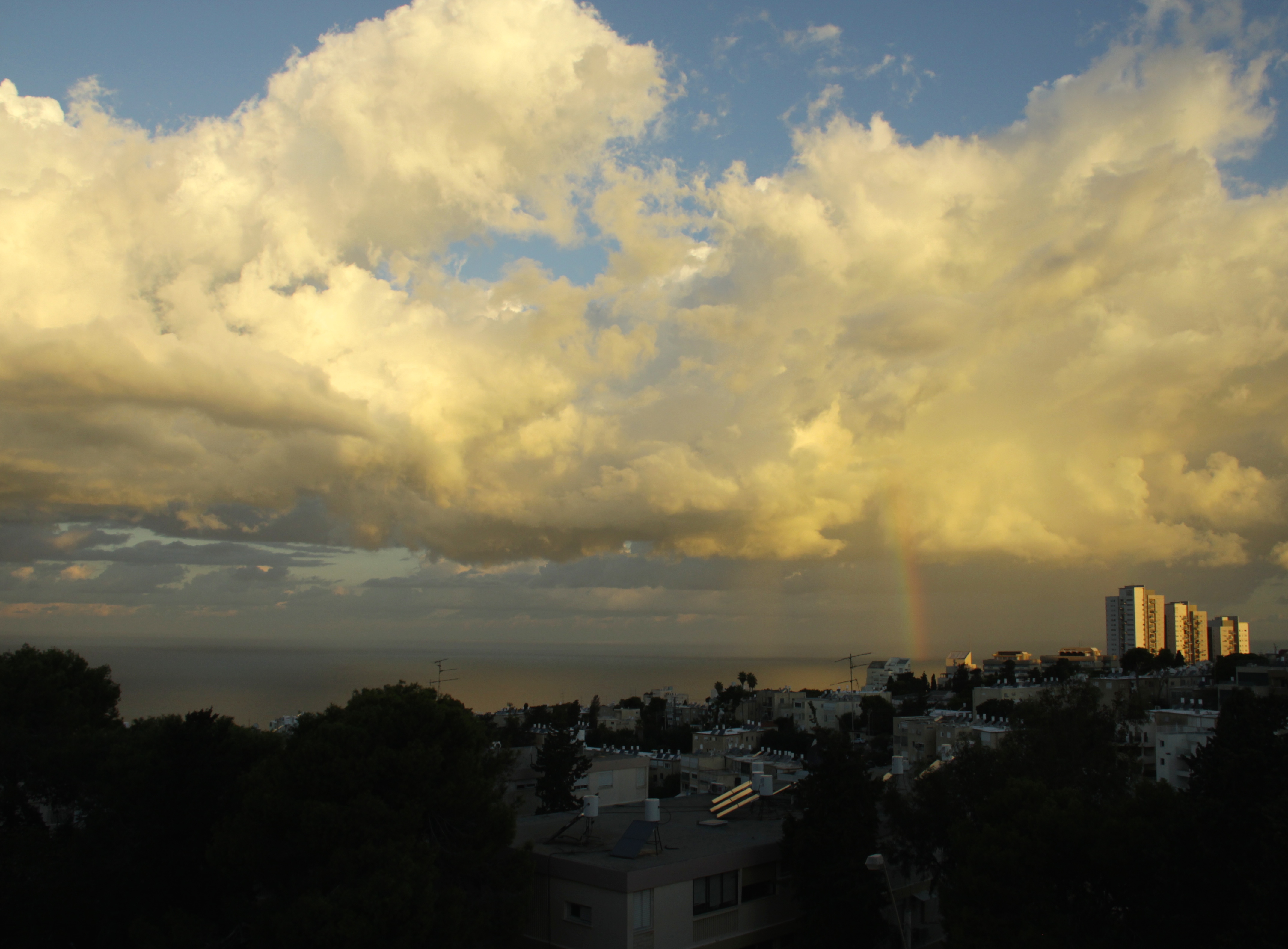 I say all that as a preface, because the struggle of the morning contrasts so intensely with the often splendid seascapes outside our windows shortly after dawn.  This week, I saw one of the most beautiful–a sunrise rainbow!  As rain sprinkled the Mediterranean, the rainbow shone forth.  After stumbling into the kitchen to make our coffee, my groggy eyes caught sight of it, and I ran into the bedroom to tell Sergey to look.