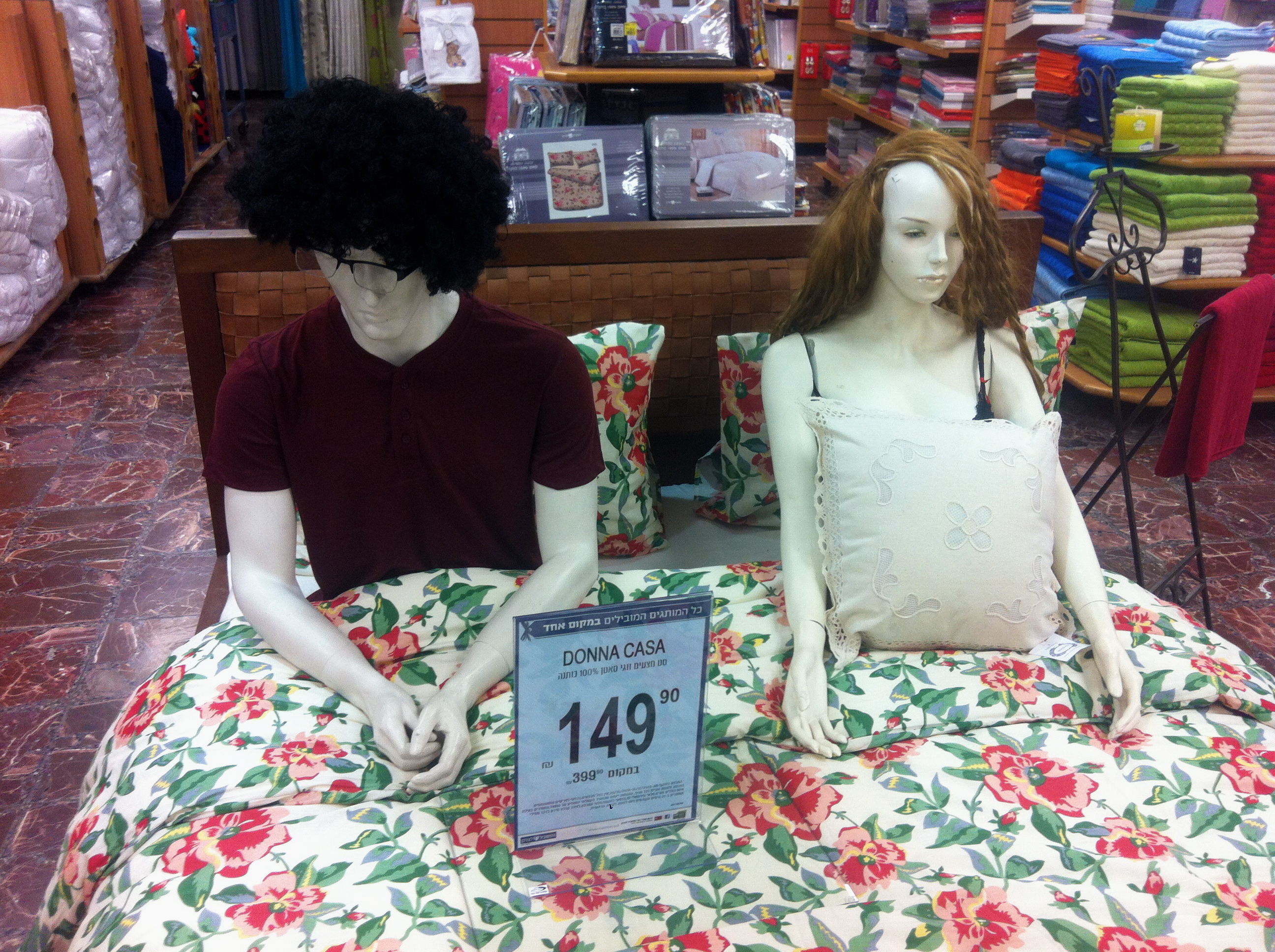 My flâneurism (which sounds like a dangerous combination of flan and aneurysm) manifested in some exploration of the Hadar, a commercial and residential district which, according to the map, my street borders.  I can’t tell you how much time I’ve spent examining maps of Haifa in a fairly futile attempt to commit the general layout of the city to memory.  There’s the tourist map I keep in my purse at all times, and the one on my bulletin board at home, and there’s even one up in the office.   So I had my route planned out, and I successfully found the main shopping street with its endless noisy clothing stores and the department store wherein I found this happy couple.  Please take a moment to note his rakishly angled spectacles and her receding hairline.  Aren’t they cozy.